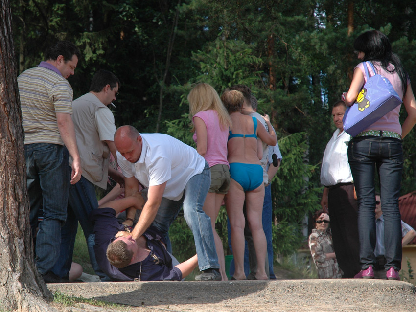 Хулиган бьёт охранника? Друг старается приподнять подвыпившего коллегу? Или, быть может, врач пытается оказать помощь пострадавшему?