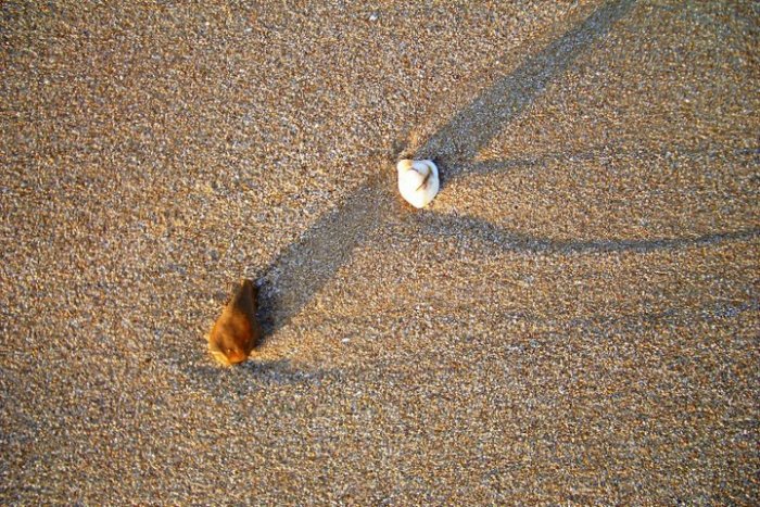 Длинные тени от звезды рано утром на пляже после пробуждения в день солнцестояния.