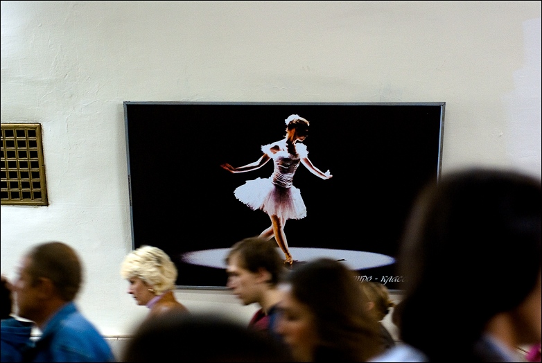 Гротеск в противопоставлении двух миров. Слегка вымышленного (тот, что на рекламе) и реального того, что мы видим каждый день. Утомленные, меланхоличные лица в метро на фоне запечатленной минуты славы и успеха. И еще хорошо чувствуется разница характеризующая два движения. Толпа идет на полувтомате, у балерины отточенное па.