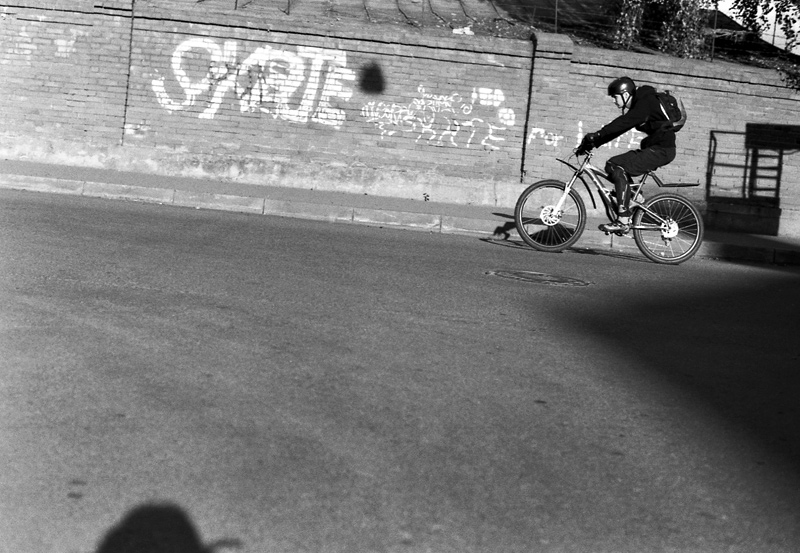 2) я долго караулила возле этой стены. прямо на проезжей части. и в момент, когда проезжал велосипедист я разговаривала по телефону. ехала машина, телефон упал, фотоаппарат тоже чуть не упал. щелкнула и отбежала. даже не надеялась что-нибудь получить. однако оказывается, что все-таки успела. завал и тень - издержки.