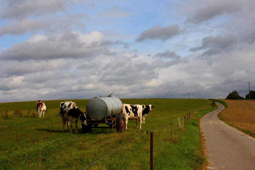 :) у них там конвейерное производство: коровы работают весь день под палящим октябрьским солнцем, а люди увозят с поля готовые бочонки молока