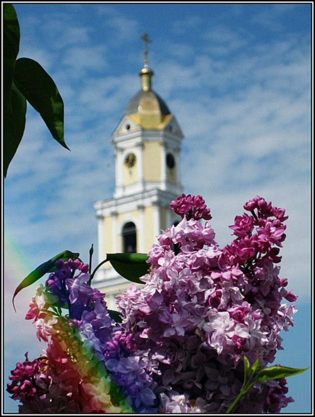 На мой взгляд, сместить бы церковь правее до трети кадра (то есть повернуться так, чтобы она там оказалась, конечно), убрать радугу, а листок в левом верхнем углу оставить как есть. Лично мне так было бы супер!)