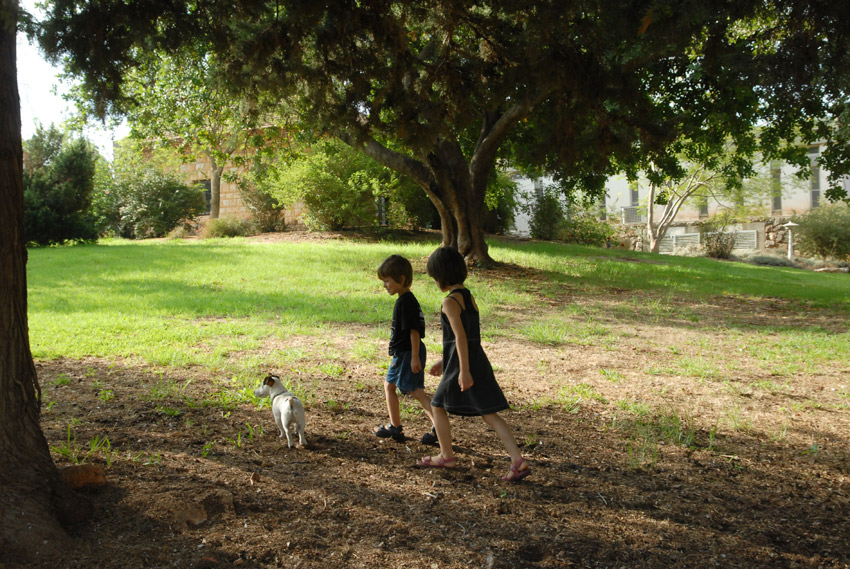 Я думаю, мне тут повезло с фазой движения - ноги-руки детей, и более или менее параллельные им - или просто организующие - вертикали деревьев на пп слева и в центре, окна дома на зп справа (спортивный зал в киббуце, между прочим, а центральный домик - библиотека). Если охота порассуждать, можно еще добавить, что дети повсюду устроят себе сказку.