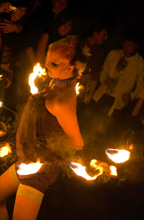 Файершоу на рок-концерте в перерыве между выступлениями. Девушка очень смело и красиво двигалась. Здесь акцент не на ней:
