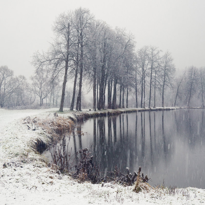 Первый снег падает на липы у пруда