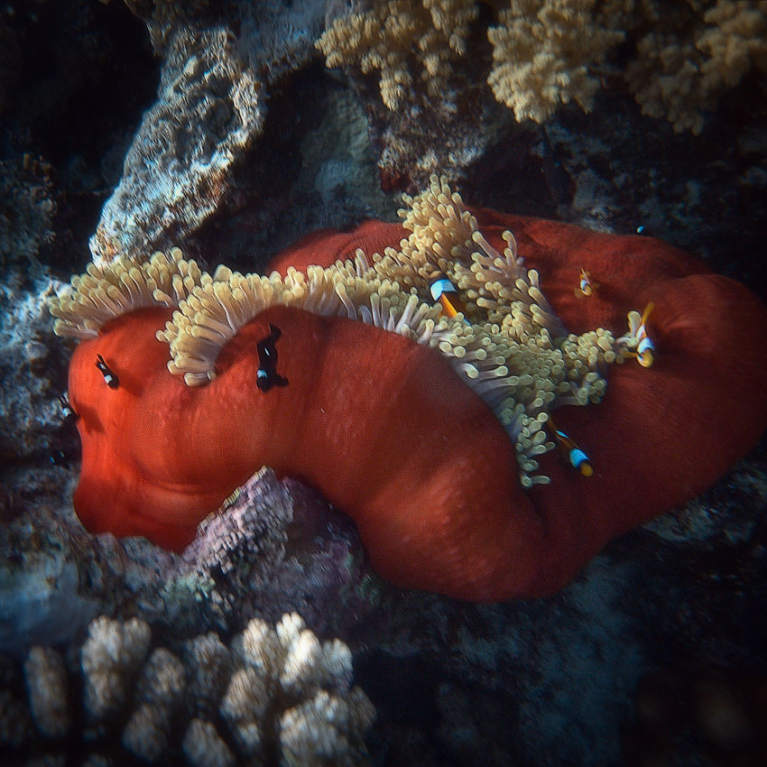 Такое количество разнообразных клоунов я видел в первые, как и цвет тела, снимать было тяжело, глубина очень маленькая, чуть не задевал телом кораллы и остановиться было невозможно, движение воды сносило, плюс наш проводник поднял шум из за того что я заплыл в запретную зону, так что снимок был сделан один в момент проплывания над актинией, больше меня туда уже не пустили. Это была экскурсия в заповедные места на островах в Красном море, километров 40 южнее городка Марса Алам