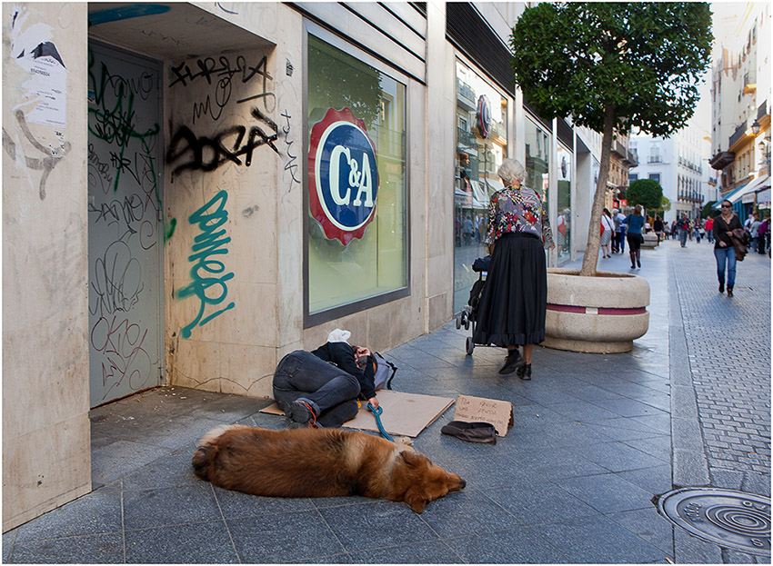 Испания. Центр Севильи. На табличке написано : `Por favor. Una ayuda. Tambien acepto comida. Gracias`. Переводится примерно так : `Пожалуйста. Нужна помощь. Также приму еду. Спасибо`.