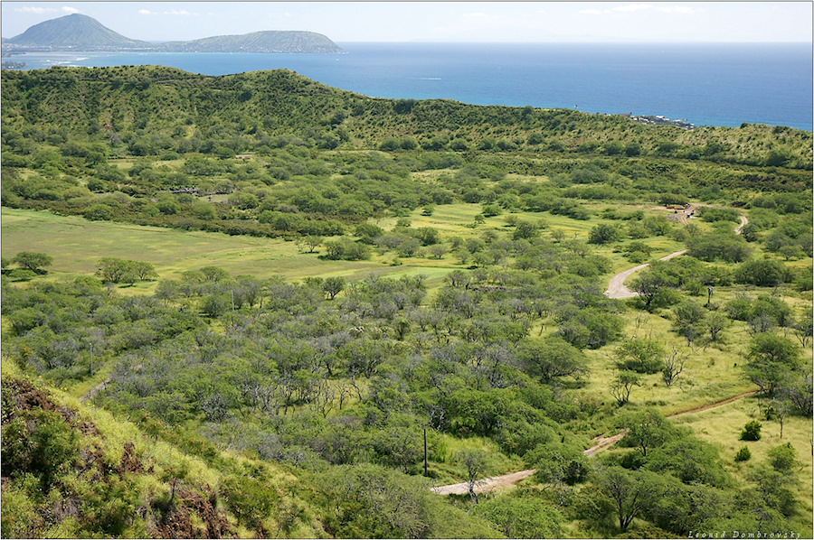 Кусочек саванны в кратере потухшего вулкана на острове Оаху (Гавайи). Вид с внутреннего склона кратера.