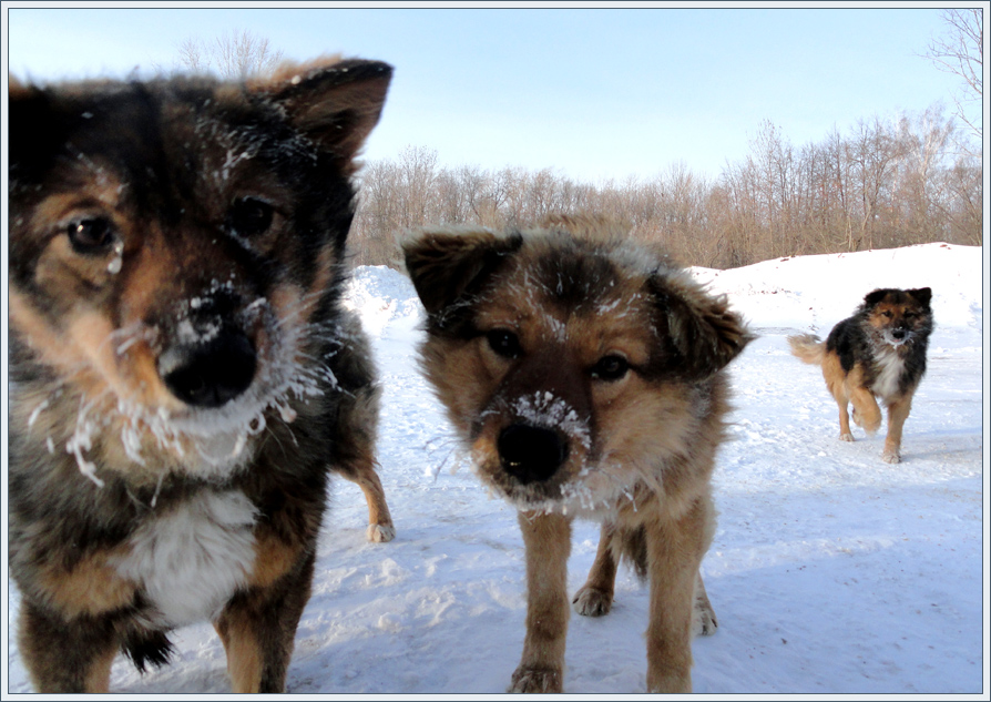 У леса, где развязка дорог на Новым мост через Волгу живет стая собак, раньше они находились на службе, охраняли домики строителей. Недавно строительство закончилось, домики увезли, а собак бросили...