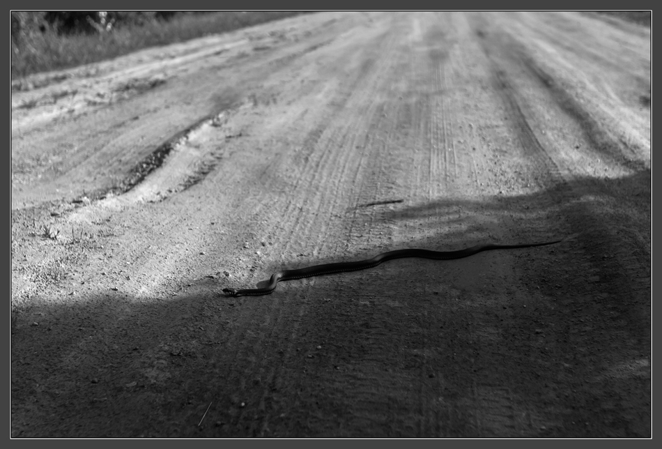 1/ Пытались мы с другом что-то ужиное найти - не получилось, думаю, гадюка. Сначала подумали, что раздавлена - я попинать хотел, передумал, потом решил сфотать - она всё это время не шевелилась. Когда фокусировка пошла - она ожила так бодренько, что неуютно стало. Длина 1,2м примерно. Короче, она так же живенько убежала, как мы живенько отскочили :)