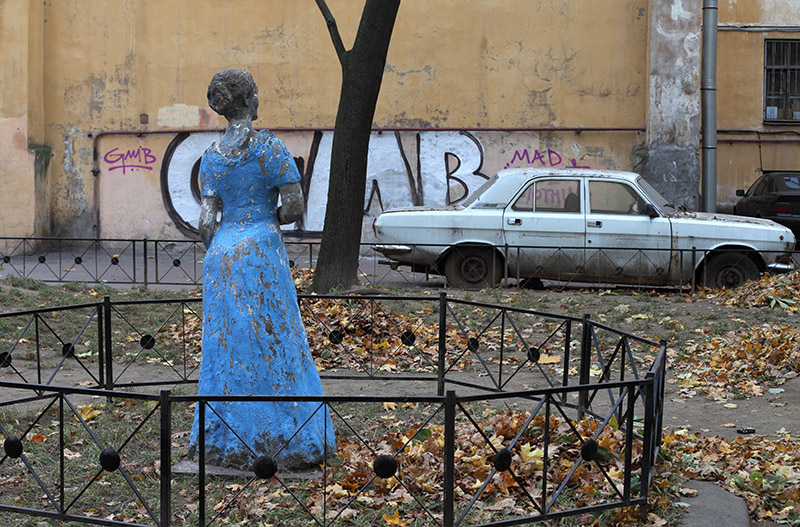 Ну для меня было примерно так: сочетание старого двора, старой скульптуры и машины. Такой момент ностальгии.