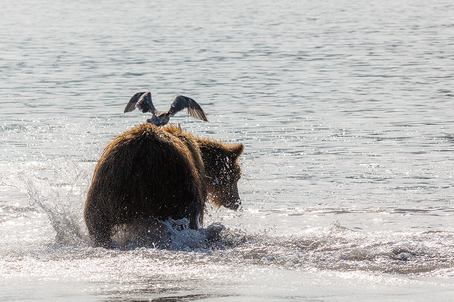 Камчатка. Курильское озеро. Медведь, ловящий рыбу и так удачно попавшая в кадр чайка. http://ratbud.livejournal.com/