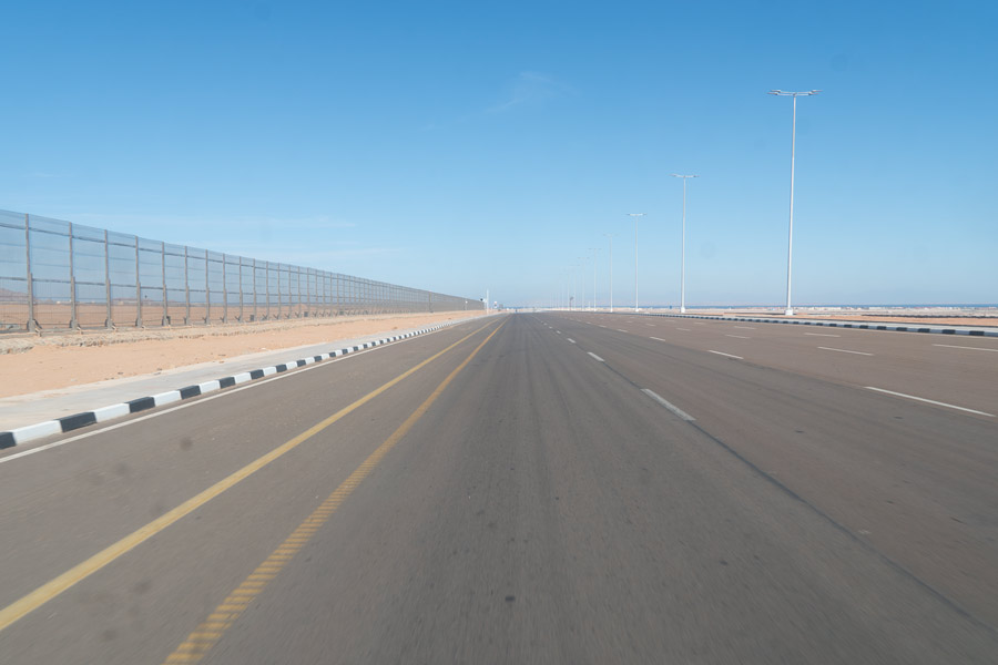Забор охраняеиого периметра и федеральная трасса. Встречное направление трассы - по ту сторону фонарного столба. Левее забора - "гуяляй поле", Синайский горы. Правее - тщательно контролируемый туристский Шарм эль Шейх. Пересечь периметр реально только через настоящий "пограничный пункт". Раньше всего этого не было.