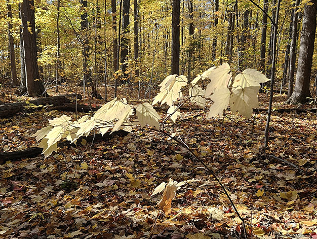 Еще оставшиеся кое-где местами зеленые ветки причудливо перемешаны с осенними тонами, то светло-лимонными, то палевыми, то оранжевыми, то розовыми и кровавыми, переходящими изредка в цвета лиловый и пурпурный. А.Куприн