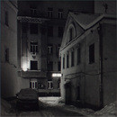 3*/_На изображении видна часть улицы и крыши зданий. В центре кадра находится участок асфальта, на котором видны следы от шин. Справа от центра кадра расположена крыша здания, покрытая металлическими листами. На асфальте видны пятна снега, которые создают контраст с тёмным асфальтом. В левом верхнем углу кадра можно заметить часть другого здания с красной дверью. В нижней части изображения видна часть стены с тёмной поверхностью. В центре кадра также находится уличный фонарь, который стоит на асфальте./Алиса/