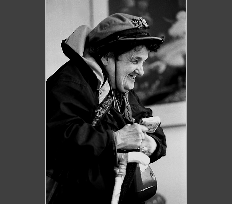 Эта старушка жив╦т очень бедно, но весело и интересно. Е╦ можно встретить на всевозможных фотовыставках в Сан Франциско. Но влеч╦т е╦ туда не только и не столько любовь к фотографии, сколько возможность заработать. Она везде таскает с собой старый раздолбанный ╚Полароид╩ и приста╦т к посетителям с просьбами их сфотографировать. Расслабленные от фотозрелища люди, охотно соглашаются и позируют. Карточки у не╦ конечно ужасные, но дело сделано и гони $5. Люди плюются, но платят, ибо понимают, что ╚обидеть художника, как обидеть реб╦нка╩, а она и есть дитя. Старое только...