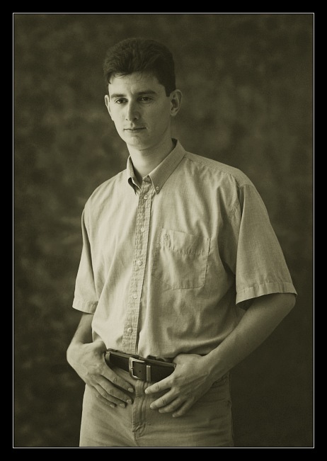 Маш, обычно такую кадрировку не делают. У тебя такой специфический тип снимка получился - не медиум, не фулл, а, так называемый, американ. Его впервые применили в американских вестернах - с целью показать героя во всей красе, ВКЛЮЧАЯ КОЛЬТЫ НА ПОЯСЕ. :)) Поскольку кольтов не имеется - я бы предпочел отрезать Вадиму э... брюки. М. б. пояс оставить, но не ниже. :))